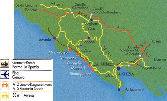 El acceso más recomendable es en tren, a través de la línea Génova-Roma. Además, el billete se segunda clase entre La Spezia y Levanto da derecho a un número ilimitado de viajes entre cualquiera de los cinco pueblos en la misma jornada o, una vez completado el sendero, volver al punto de partida. En coche se puede llegar hasta Riomaggiore o Manarola más fácilmente, ya que a los otros tres pueblos sólo llegan carreteras mucho más tortuosas. En verano, también es posible el acceso en barco desde otras localidades cercanas con las compañías Navigazione Golfo dei Poeti o Navigazione Ligure Tirrena.