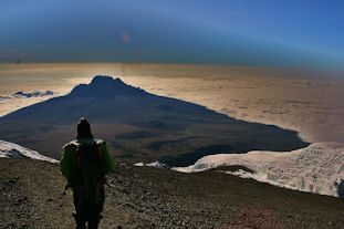 – Sexto día: Barafu Hut – Uhuru Peak (cima del Kilimanjaro): 25 kilómetros en total (primero, ascenso nocturno de 4.670 a 5.895 metros; después, descenso a Barafu Hut y, más tarde, a Mkewa Hut, de 5.895 hasta los 3.100 metros).