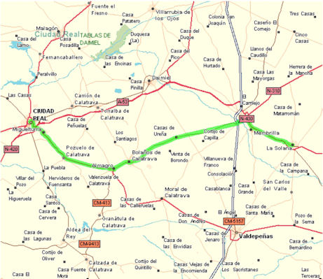 De aquí emprendemos rumbo a Ciudad Real. Son treinta kilómetros por la N-420, que no tiene mucho tráfico puesto que existe una autovía paralela en la misma dirección. En este tramo os encontrareis nuevamente con toboganes que serán más molestos que en el tramo anterior, pero lo más pesado es soportar el viento, cuya fuerza ya se había convertido en un serio impedimento que en la práctica nos hizo duplicar el tiempo para llegar a la meta. En los momentos en los que ya el viento se ponga furioso, la única solución es tomarlo con paciencia y calma, poner el desarrollo más alto y poco a poco ir avanzando. Existe otro recurso que es parar; sin embargo no es la buena opción puesto que probablemente el viento irá en aumento hasta que desaparezca la luz del día.