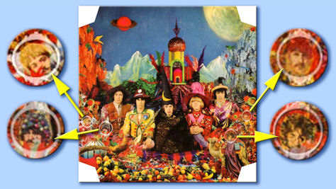Portada de Their Satanic Majesties Request de The Rolling Stones, con la localización de los cuatro componentes de The Beatles